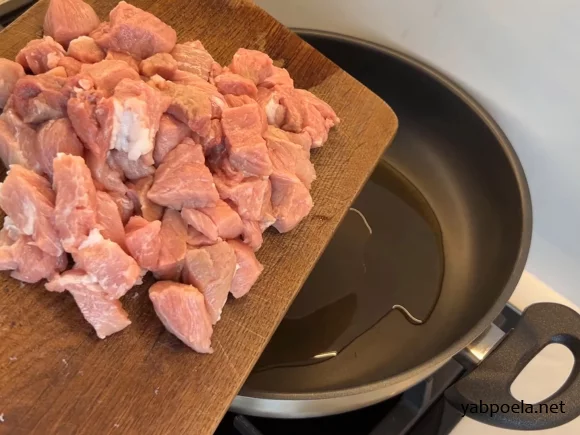 Свинину нарежем небольшими кусочками. Выкладываем обжариваться на разогретую сковороду с небольшим количеством растительного масла.