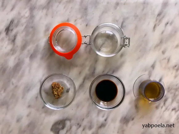 Для начала делаем маринад. Для удобства использую баночку с плотно закрывающейся крышкой, в которой смешиваю оливковое масло, горчицу и бальзамический уксус. Хорошо трясу баночку и все смешивается в однородную смесь.