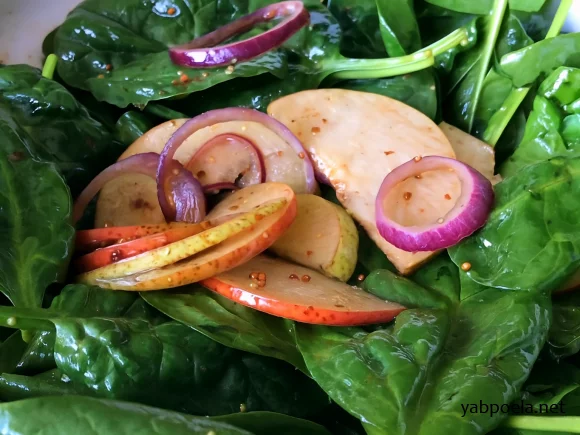 Свежий шпинат делает салат полезным и витаминным, а заправка объединяет все ингредиенты в идеально сбалансированный ансамбль. Такой салат подойдёт и как лёгкий ужин, и как яркая закуска к праздничному столу.