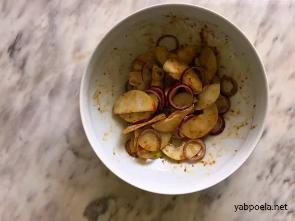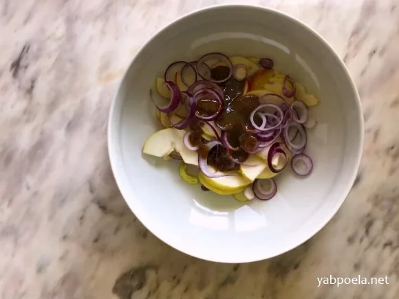 Нарезанные грушу и лук перекладываем в салатник и поливаем маринадом.