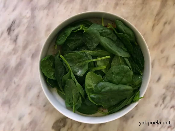 Затем добавим в салатник свежий шпинат. Соль по вкусу.