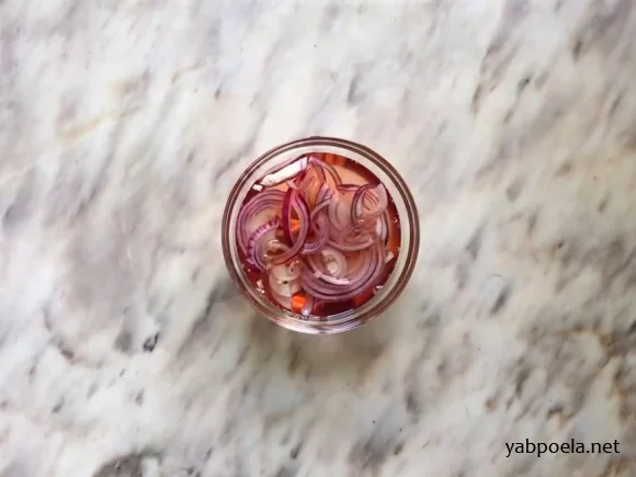 Половинку красного лука нарезаем тонкими полукольцами, заливаем водой и винным уксусом. Отставляем в сторонку мариноваться.