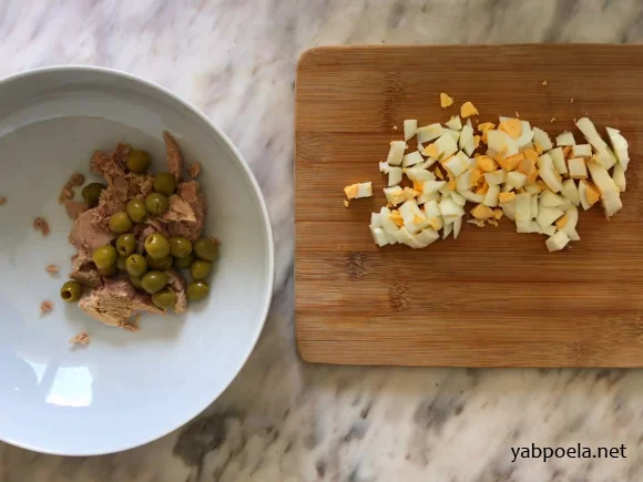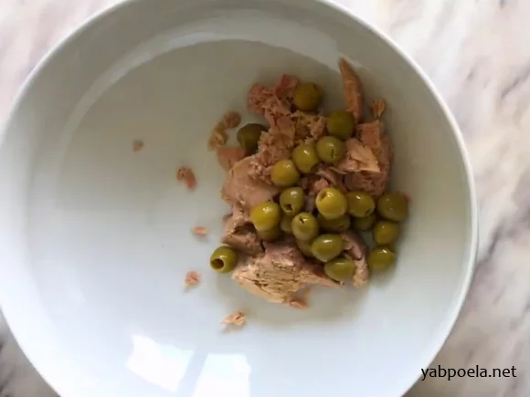 В глубокую миску перекладываем тунец и зеленые оливки без косточки.