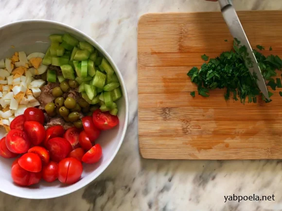 Лёгкая заправка на основе оливкового масла объединяет все ингредиенты и придаёт блюду средиземноморскую свежесть. Такой салат идеально подходит для лёгкого обеда или ужина, а также украсит праздничный стол.