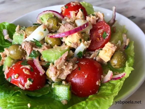 Салат Ницца с тунцом готов. Подавайте на листьях салат в дополнении с тостами из цельнозернового хлеба или багетом.