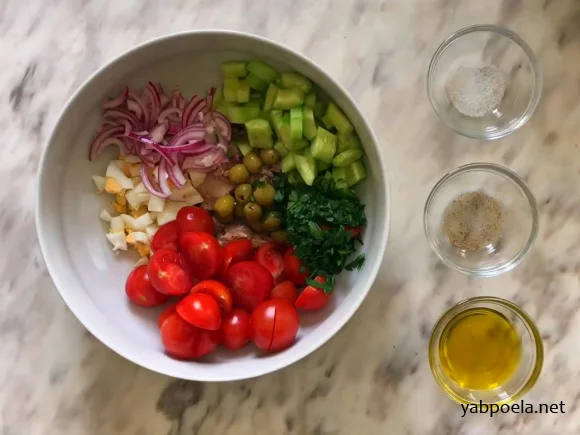 Классический салат «Ницца» в лёгком исполнении — это яркое сочетание свежих овощей, тунца и оливок. Салат получается одновременно питательным и лёгким: сочные помидоры черри, хрустящий огурец, маринованный красный лук и зелёные оливки отлично гармонируют с нежным тунцом.
