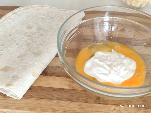 Яйцо слегка взбиваем вилкой. Добавляем к нему сметану, перемешиваем.