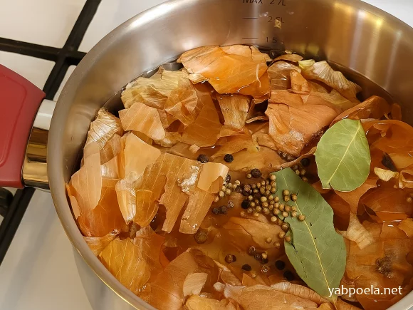 После закипания варите 5 минут, чтобы специи раскрыли аромат. Луковая шелуха придаст красивый золотистый цвет.