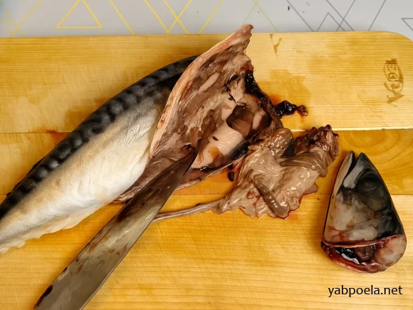 Пока маринад остывает, почистите скумбрию: удалите голову, выпотрошите, промойте брюшко и уберите все темные пленки. Хорошо ополосните под водой.