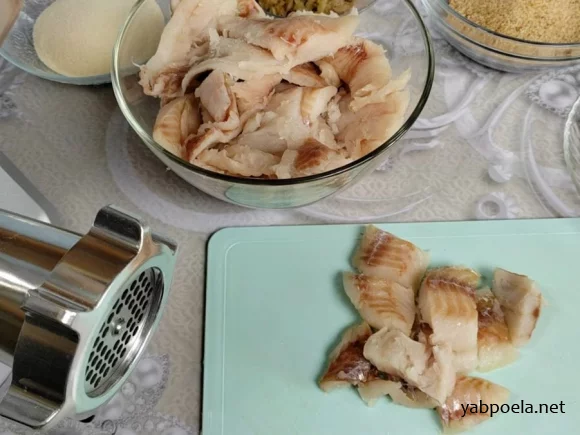 Если филе минтая было заморожено, разморозьте его и слегка отожмите от лишней жидкости — это важно, чтобы фарш не получился водянистым. Нарежьте рыбу небольшими кусочками для мясорубки.