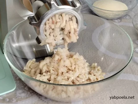 Пропустите через мясорубку филе минтая, половину сырой луковицы и сало (солёное или свежее — любое подойдёт).