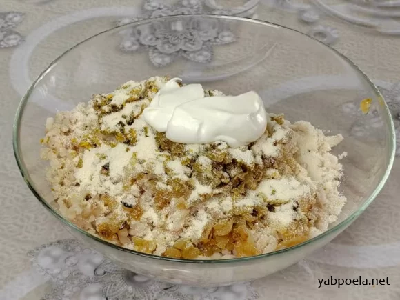 Добавьте приправу для рыбы (или любые специи по вкусу), манку, сметану и, при желании, одно яйцо. Всё хорошо перемешайте. Если используете приправу без соли — не забудьте посолить.
