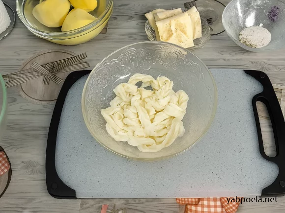 - Нарезка картофеля: Нарежьте картофель (400 г) мелким кубиком. Если нет желания резать, натрите на крупной терке.