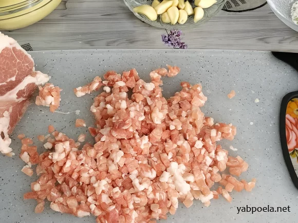- Нарезка мяса: Возьмите подмороженное мясо (лопатку) и нарежьте его мелким кубиком или мелкими кусочками. Если не хотите резать, пропустите через мясорубку с крупной сеткой. Отправьте рубленое мясо в чашку.