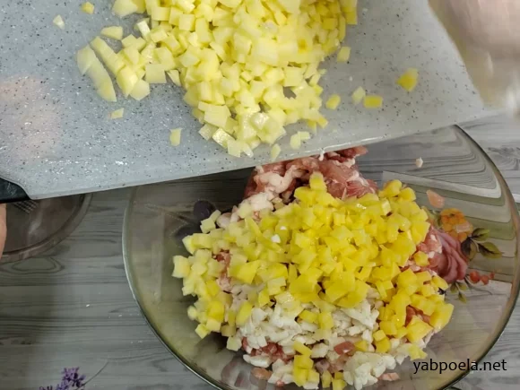 - Смешивание: Отправьте картошку к мясу и сразу же перемешайте, чтобы она не потемнела.