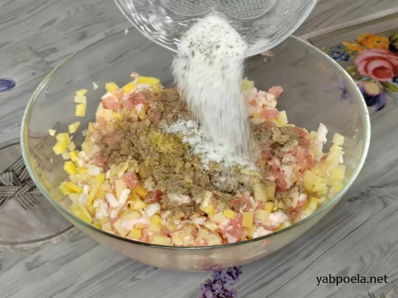 - Замешивание: Тщательно вымешайте фарш. Больше приправ не добавляйте (только по своему вкусу).