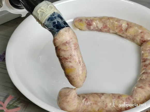 - Проколы: Обязательно сделайте проколы иголкой по всей длине оболочки, чтобы выходил пар и колбаса не лопнула.