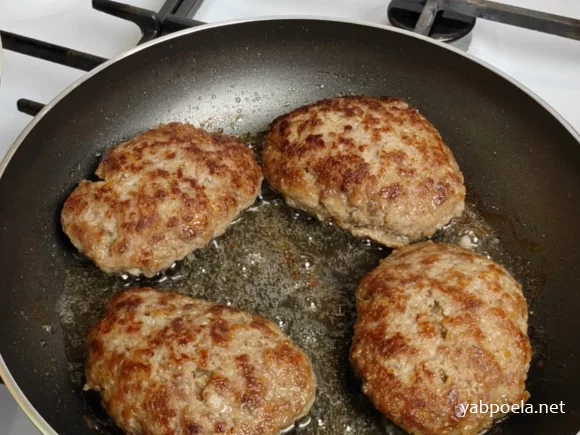 - Жарка без панировки: Выложите котлеты. Панировка (мука или сухари) не требуется, так как в фарше достаточно хлеба. Котлеты прекрасно жарятся без нее.
