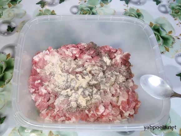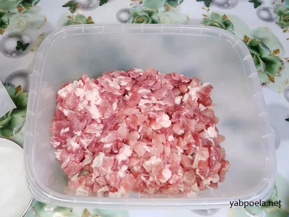 Мясо нарежьте некрупными кусочками (примерно 1x1 см или 1,5x1,5 см). По желанию, 30% мяса можно пропустить через мясорубку.