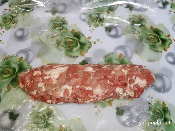 Выложите все мясо на пакет. Руками подправьте его, формируя батончик, чтобы внутри оставалось меньше пустот.