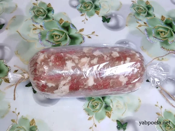 Прежде чем завязать вторую сторону, максимально утрамбуйте мясо, помассируйте, чтобы выгнать воздух и уменьшить пустоты. Крепко завяжите вторую сторону. Обрежьте лишние концы ниток и пакета.