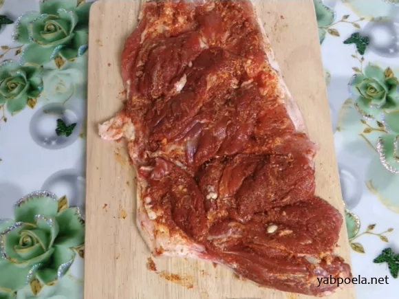 Разрежьте толстые мясные части рульки, чтобы раскрыть ее «книжечкой» и создать равномерный пласт. Срезанные кусочки мяса используйте, чтобы заполнить тонкие или пустые места.