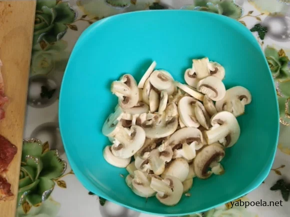 Нарежьте 250 г шампиньонов вдоль довольно толстыми кусочками (не мелко).