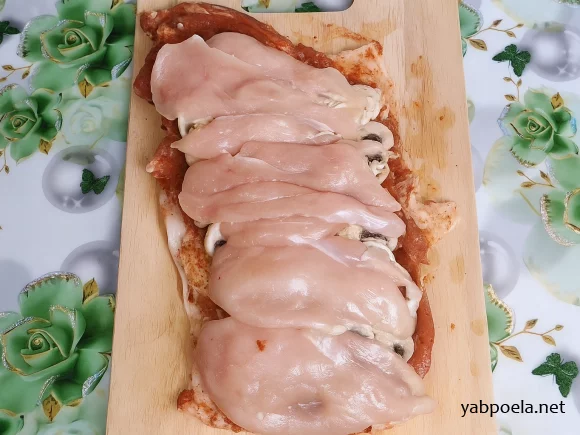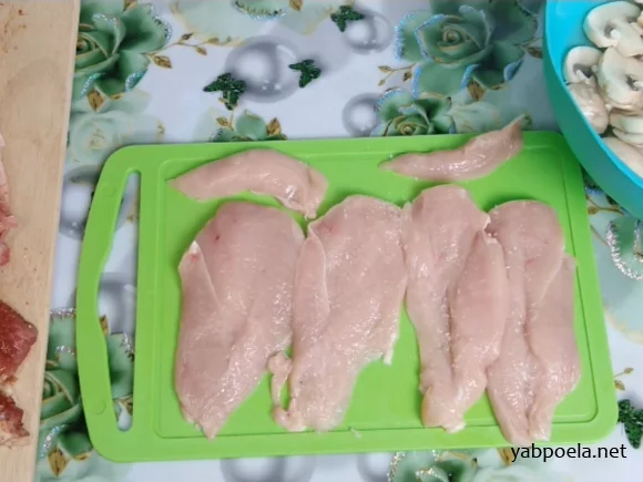 Сначала выложите на рульку отцеженные грибы. Затем — куриное филе.