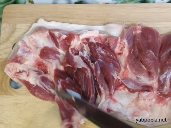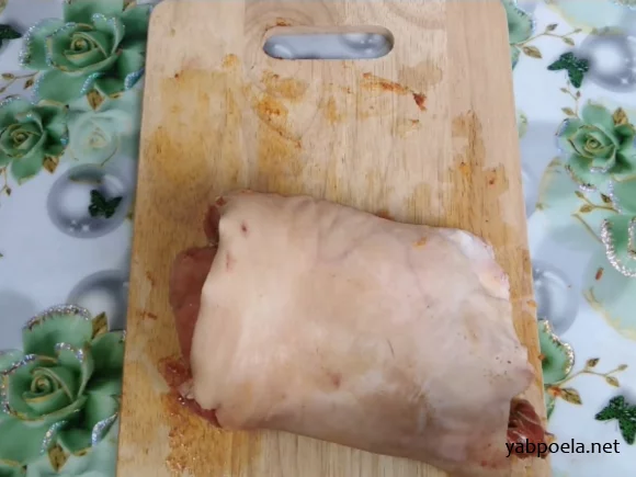 Аккуратно отделите кость ножом, стараясь не повредить кожу. Удалите все твердые сухожилия и жесткие пленки.