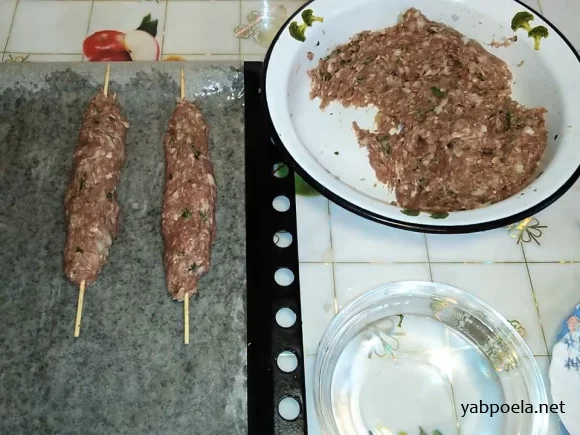 Нанизайте фарш на шпажку (25 см). Равномерно распределите мясо по шпажке, слегка растягивая.