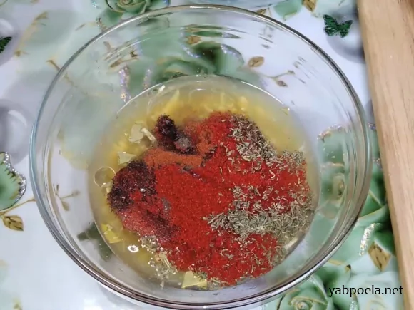 Покрошите лавровый лист. Добавьте 3 ст. л. соевого соуса, 3 ст. л. масла, 0,5 ч. л. тимьяна, 1 ч. л. паприки, 1 ч. л. черного перца и 1/3 ч. л. острого красного перца. Все хорошо перемешайте.