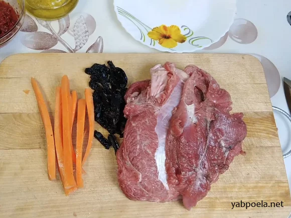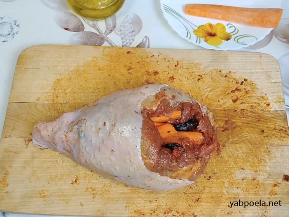 Выверните голень, чтобы кожа была снаружи. Если отбитое мясо порвалось, сложите его внутрь. Заполните полость черносливом и морковными палочками.