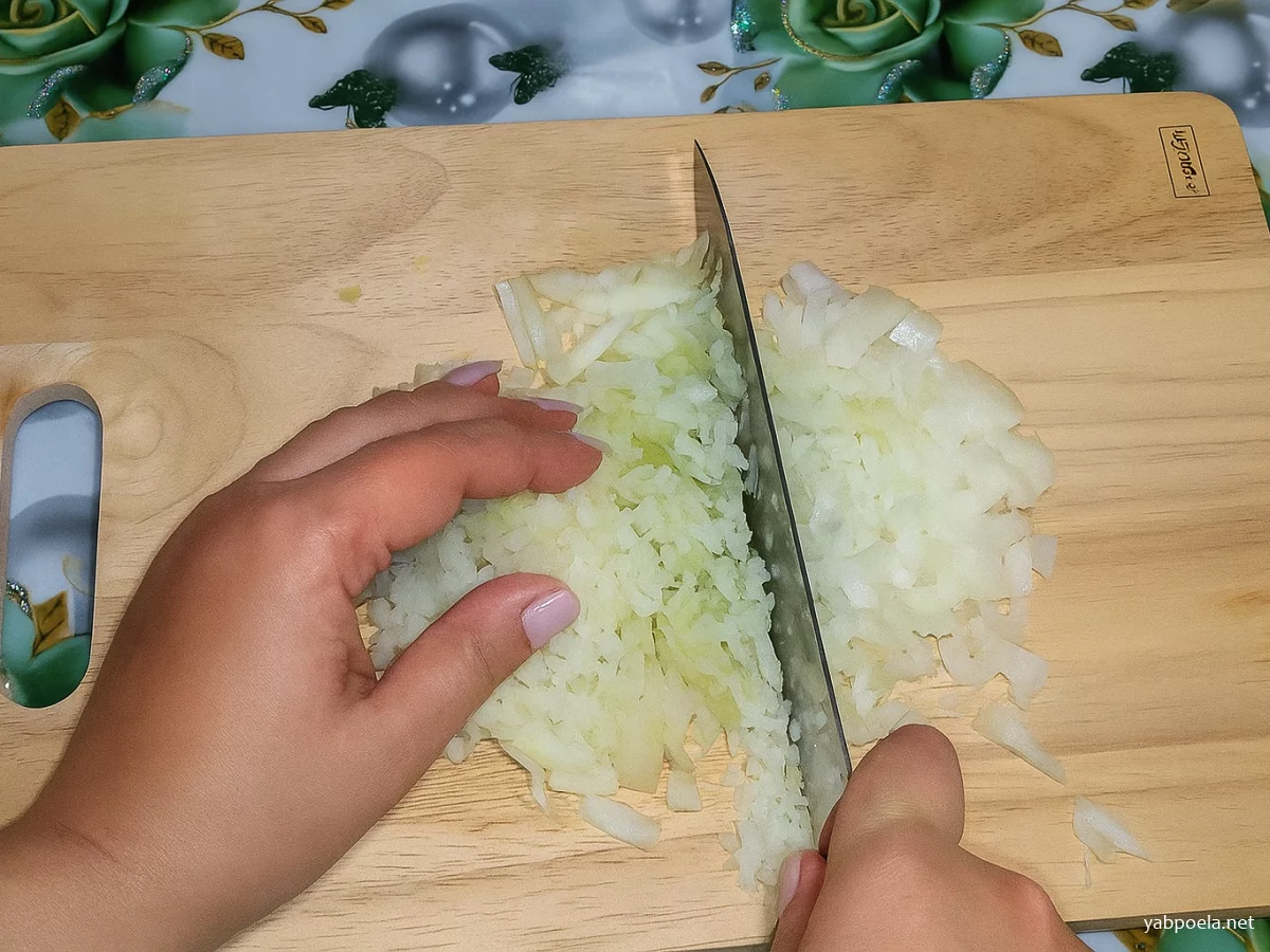 Дополнительно порубите нарезанный лук ножом, чтобы он стал совсем мелким.