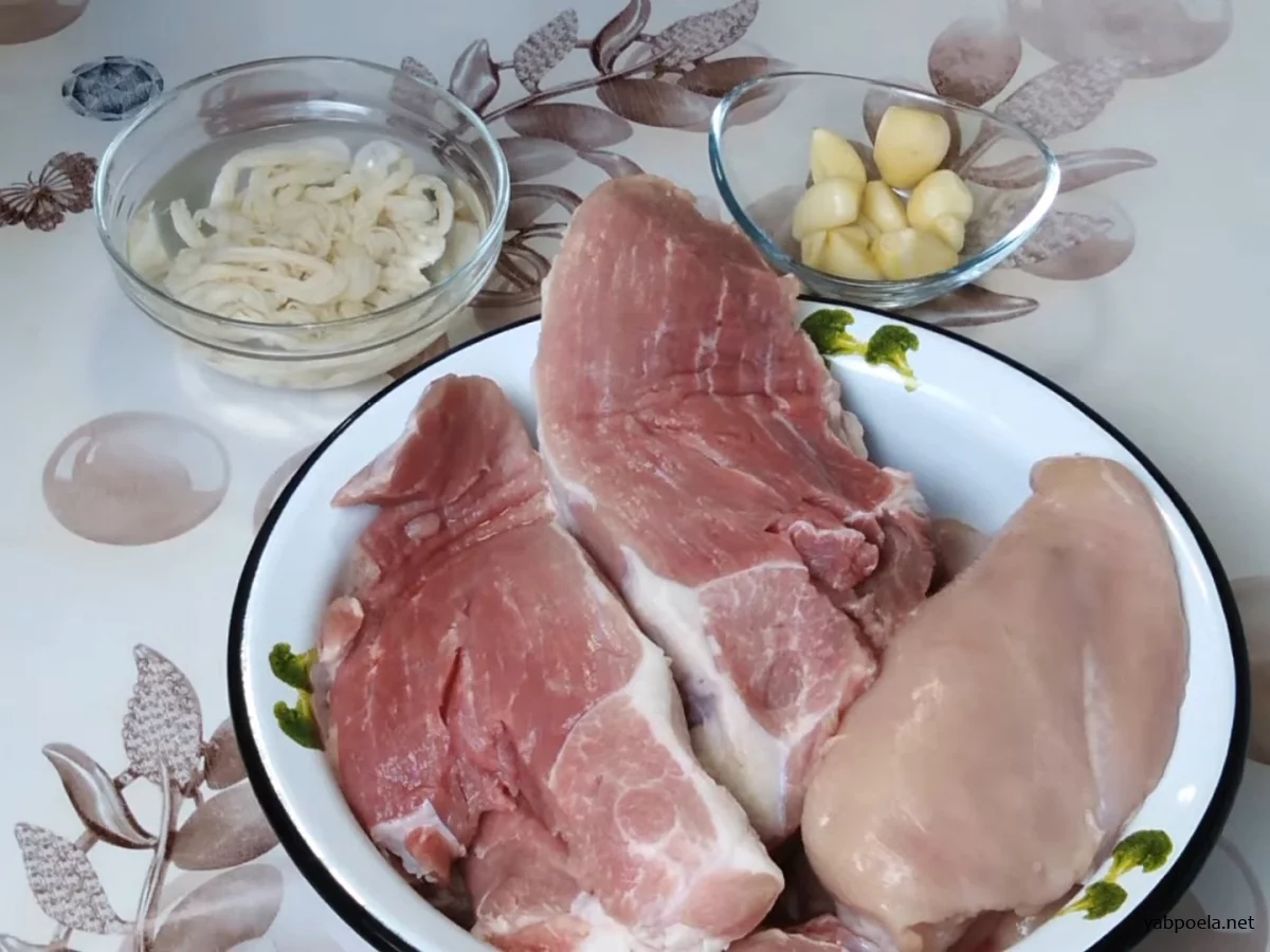 - Свинину пропустите через мясорубку вместе с большей частью чеснока (5–6 зубчиков).