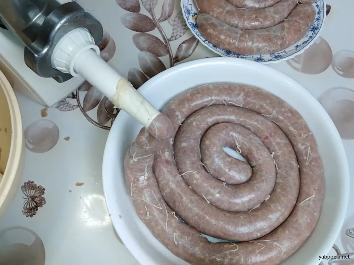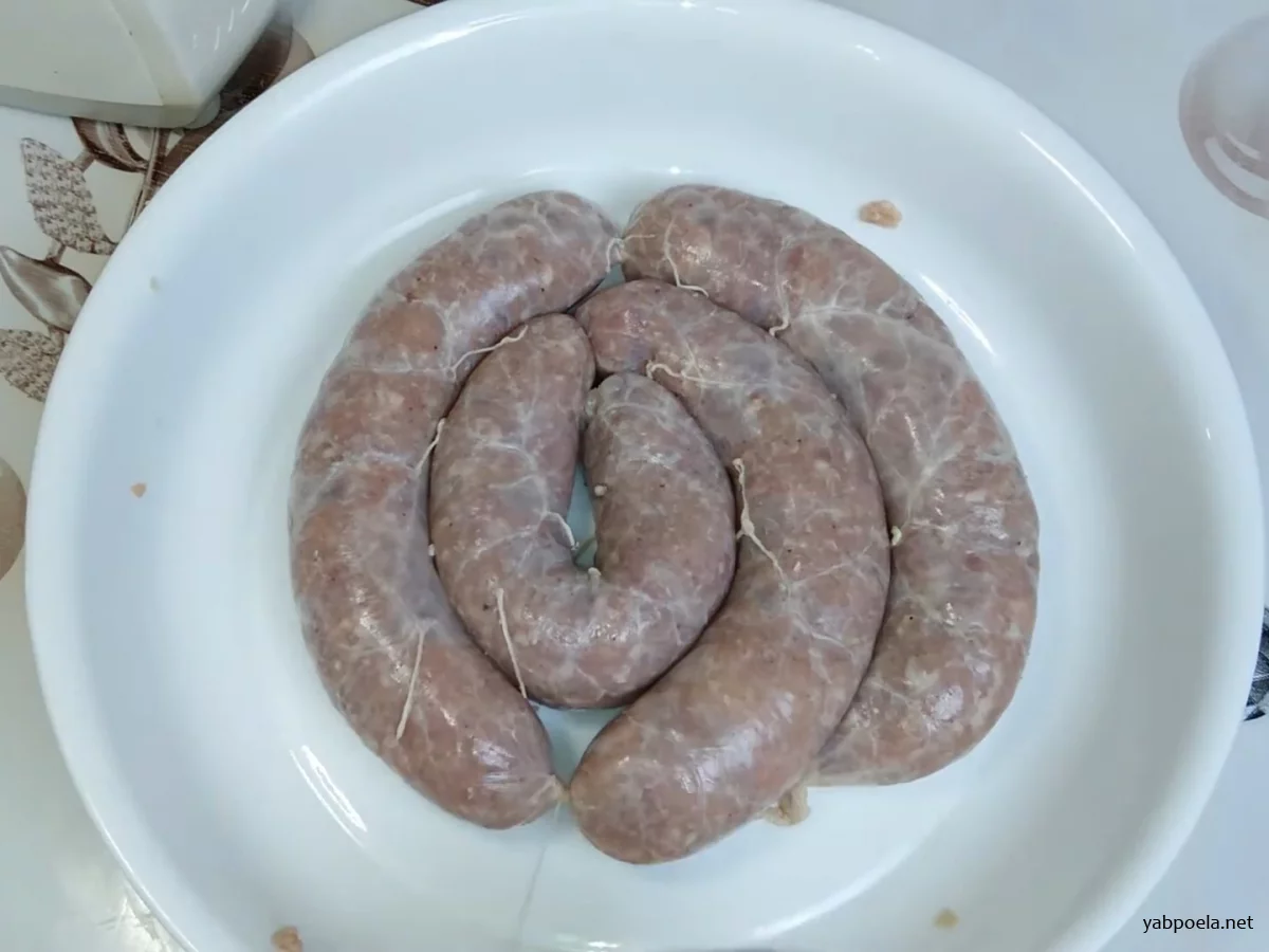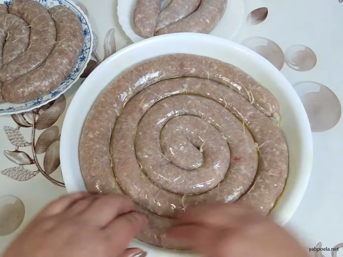 Вы можете свернуть колбасу одной большой «улиткой» или перекручивать кишку каждые 10–15 см, формируя отдельные колбаски (сардельки). Если делаете отдельные колбаски, перекручивайте их в разные стороны, чтобы они не разматывались. Края завяжите хлопковой нитью.