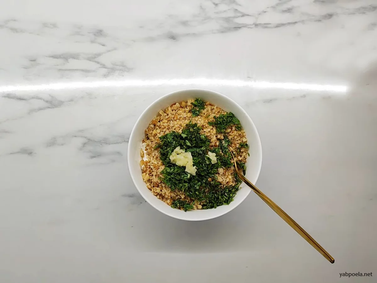 Орехи нужно предварительно нарубить, зелень измельчить.