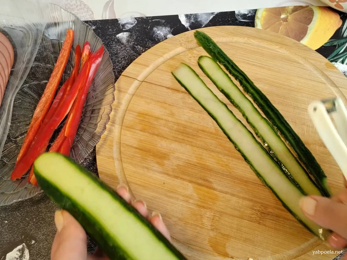 - Огурец нарежьте тонкими слайсами (пластинами) вдоль или тонкими кружочками. Можно использовать овощечистку для получения идеально тонких слайсов.