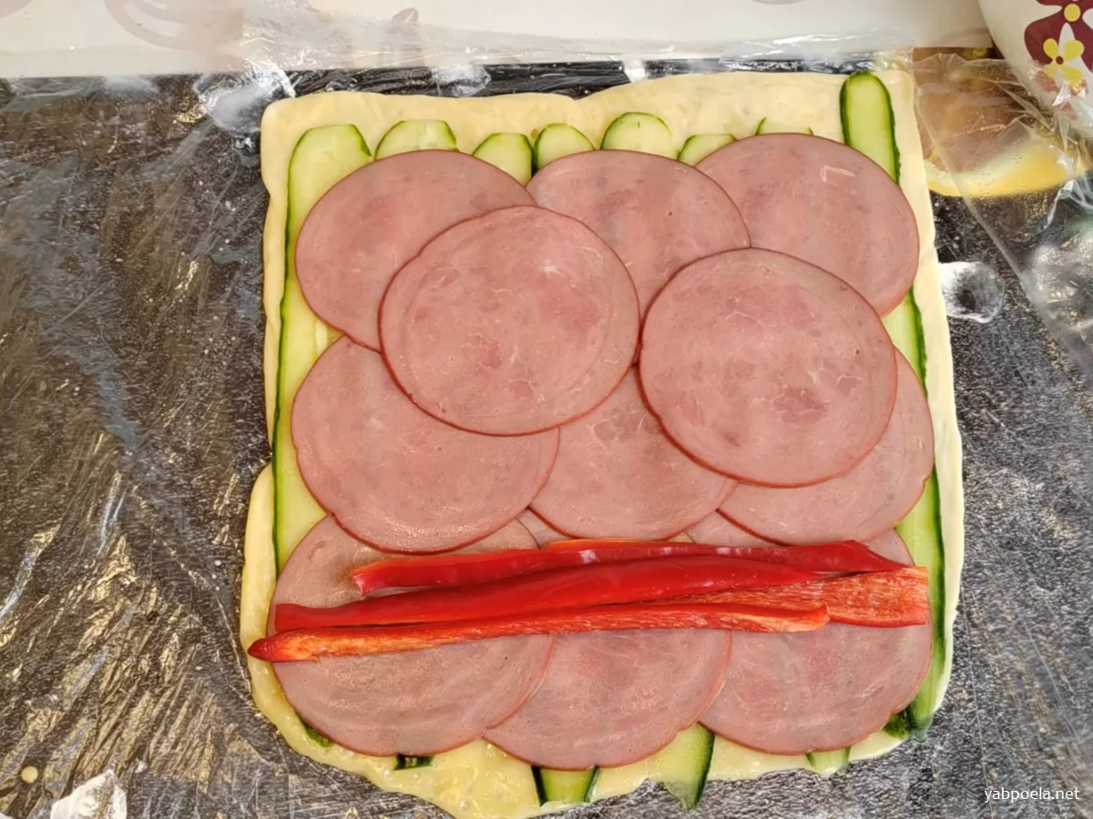 - Слой 3: В центр (или ближе к краю начала сворачивания) положите полоски болгарского перца.