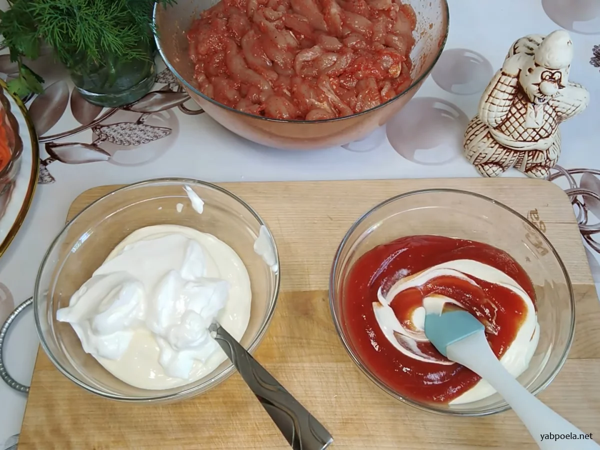 - Белый соус: Смешайте сметану и майонез (1:1). Добавьте тертый чеснок, черный перец и мелко нарезанную кинзу. Перемешайте.
