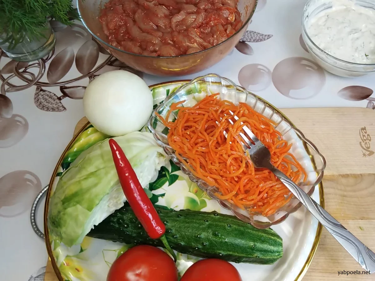 - Слои: Капуста ➔ Морковь по-корейски ➔ Мясо (не жалейте!) ➔ Лук ➔ Острый перчик ➔ Еще немного соуса сверху ➔ Огурцы ➔ Помидоры.