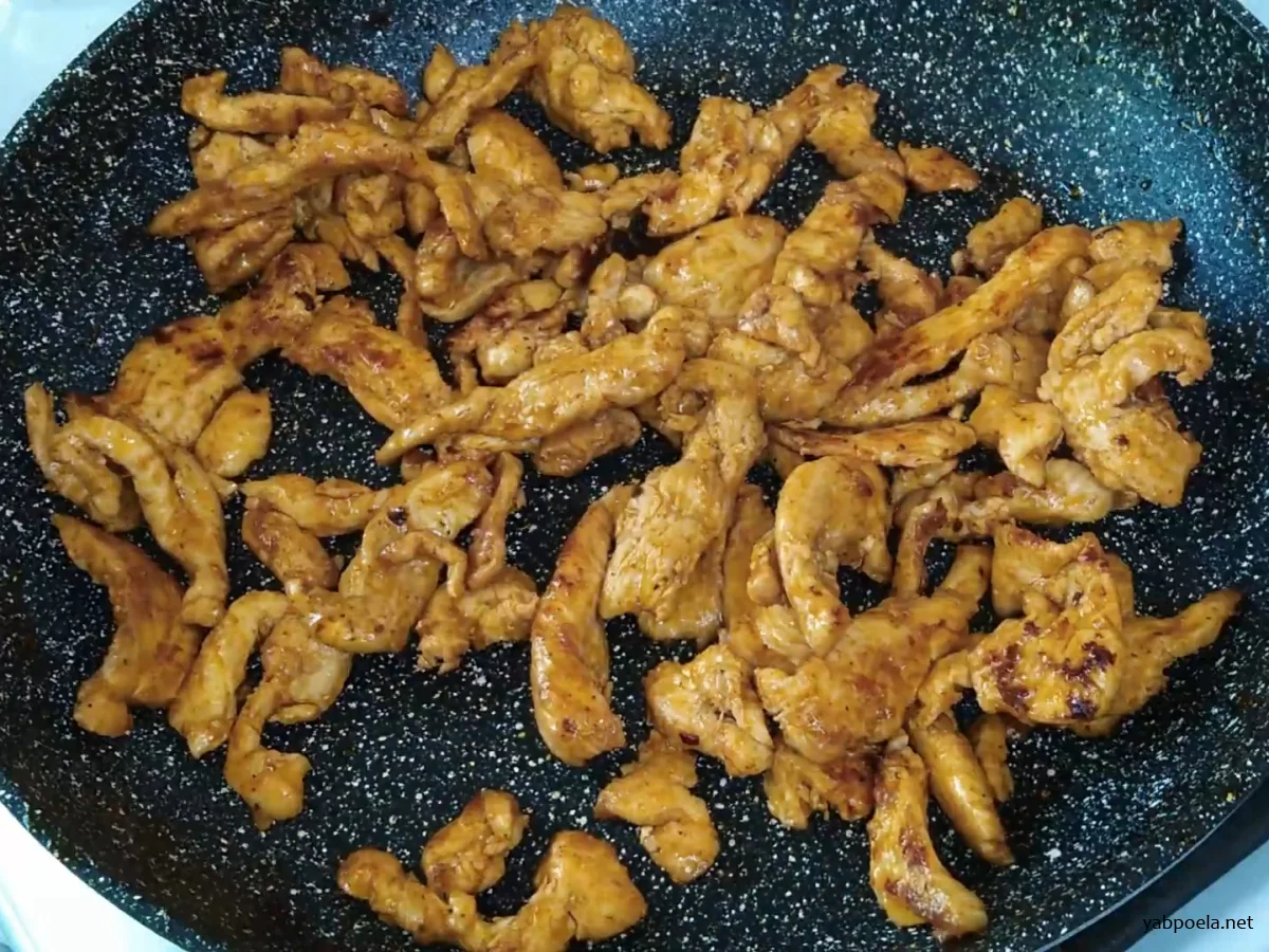 Разогрейте сухую сковороду (масло уже есть в маринаде). Выкладывайте курицу партиями (в один слой), чтобы она жарилась, а не тушилась.Жарьте на сильном огне 4–5 минут (по 2–3 минуты с каждой стороны) до золотистого цвета. Не пересушите!