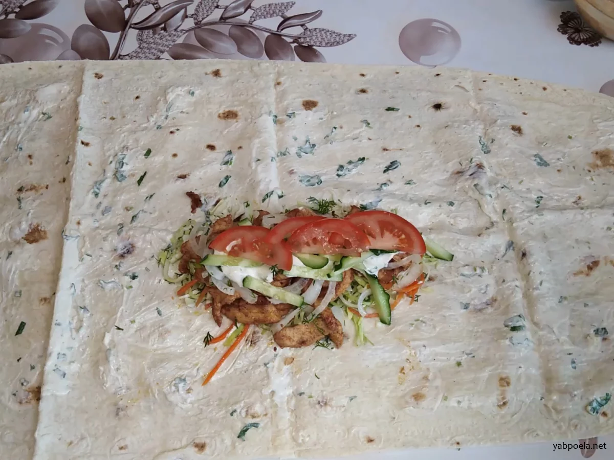 - Аккуратно сверните шаурму конвертом, плотно прижимая начинку.