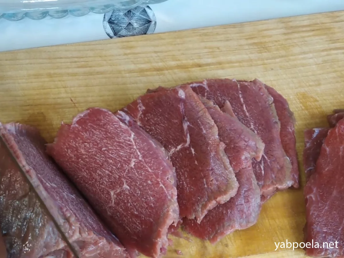 Чтобы нарезать мясо идеально тонкими слайсами (не более 3 мм), его желательно предварительно слегка подморозить в морозилке. Нарежьте подмороженное мясо поперек волокон тонкими пластинками. Сложите в глубокую миску.