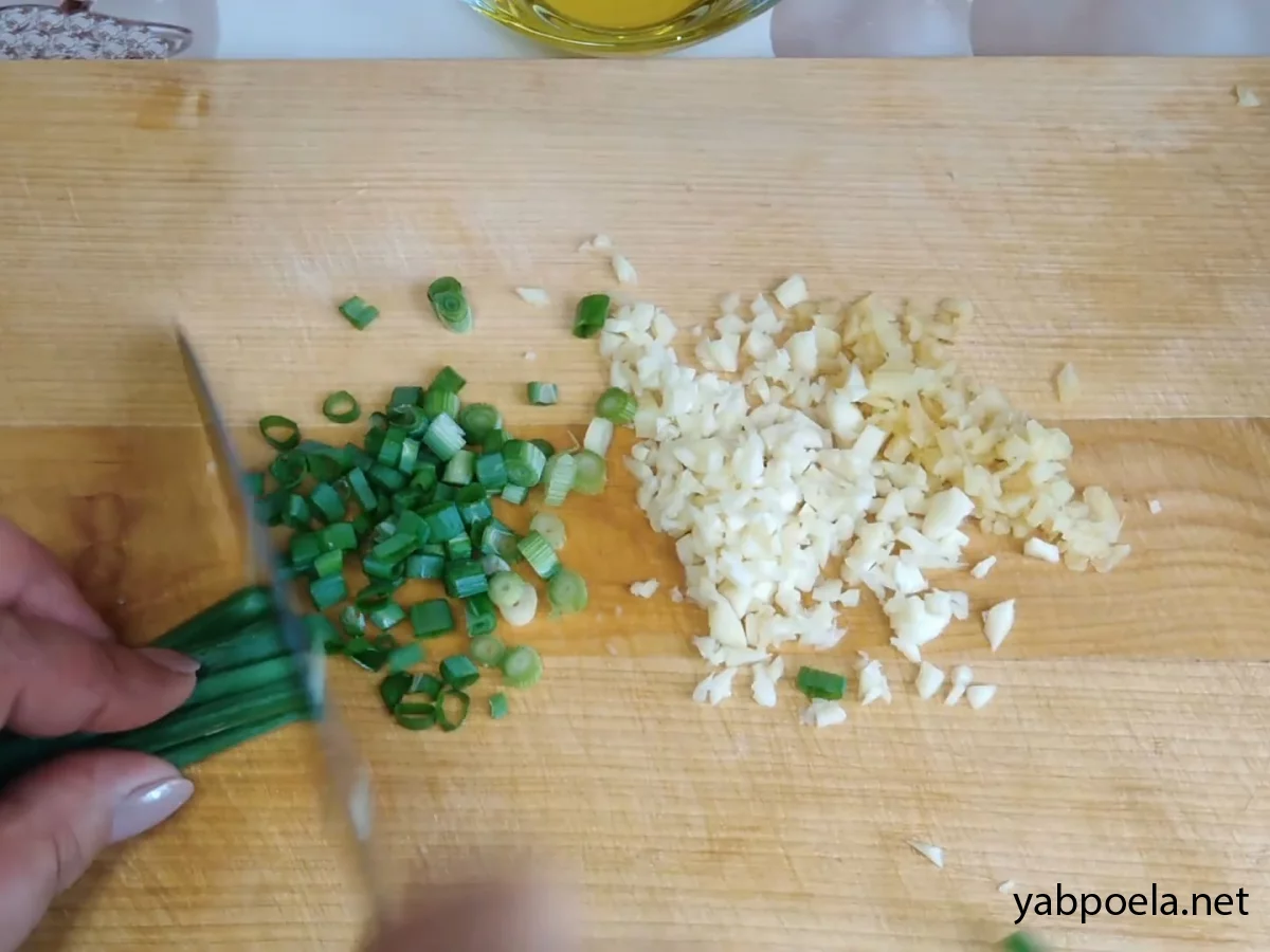 Чеснок и имбирь мелко нарежьте ножом (или натрите). Зеленый лук мелко порубите.