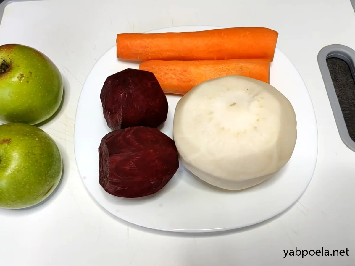 Морковь, свеклу и редьку очищаем сразу. Яблоки очистим позже, иначе они потемнеют.