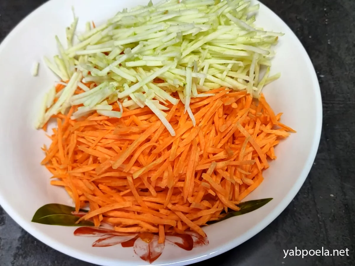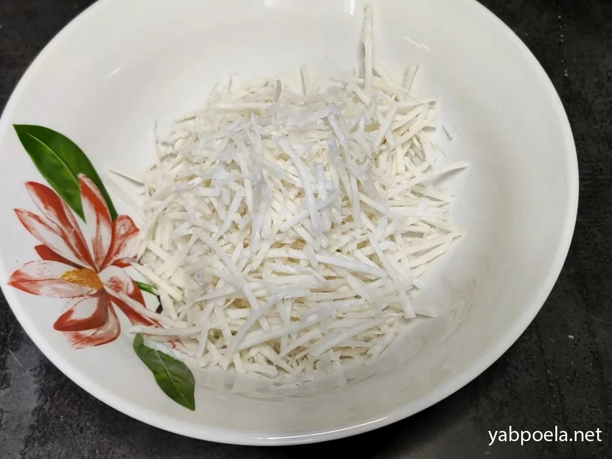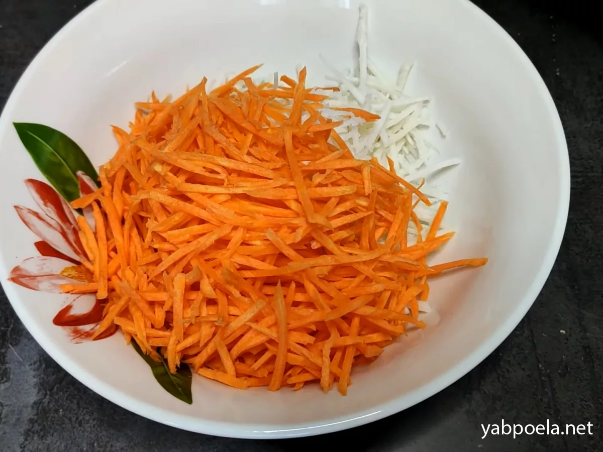 Редис натираем на терке соломкой. Отправляем его в салатник.