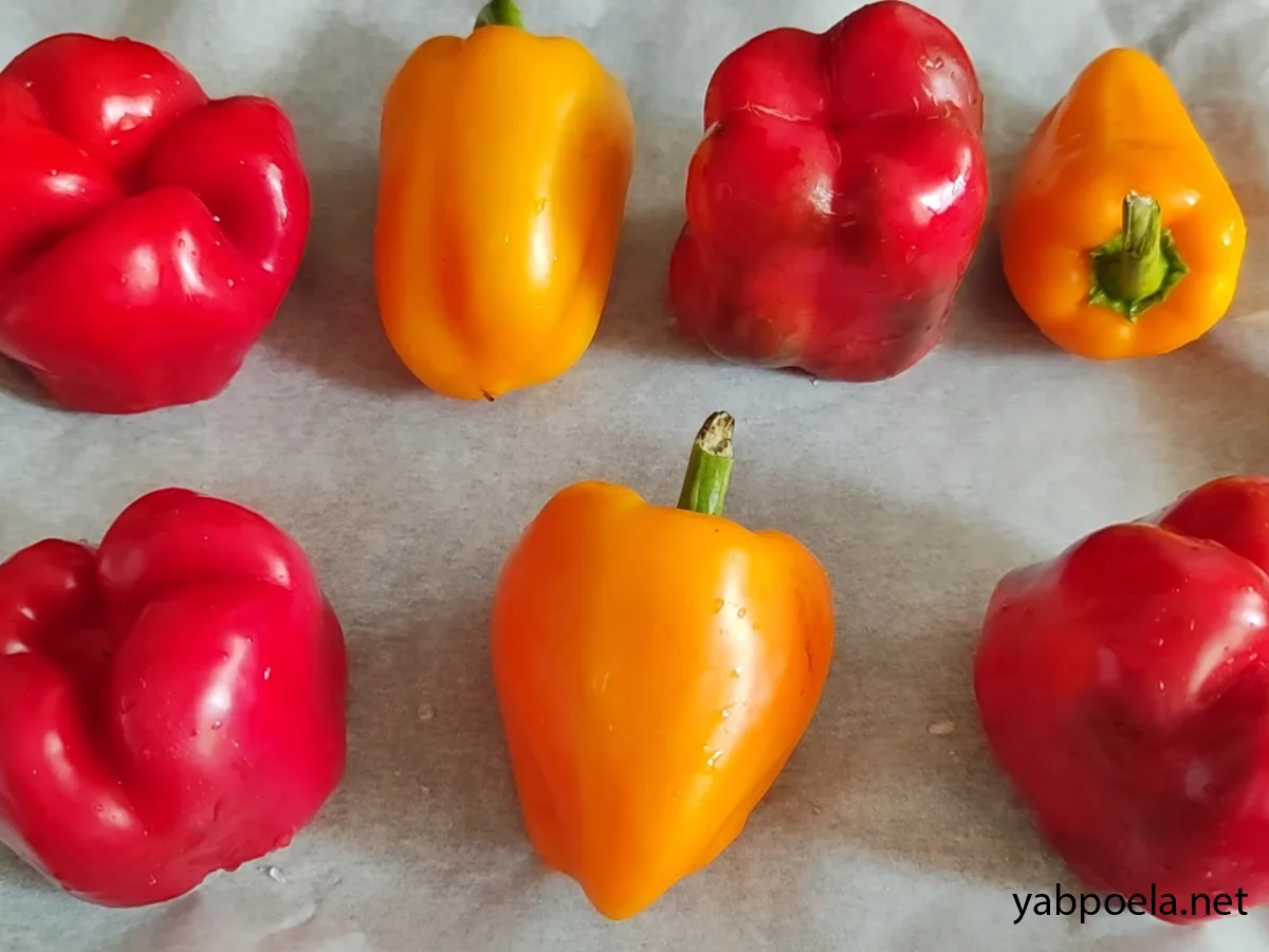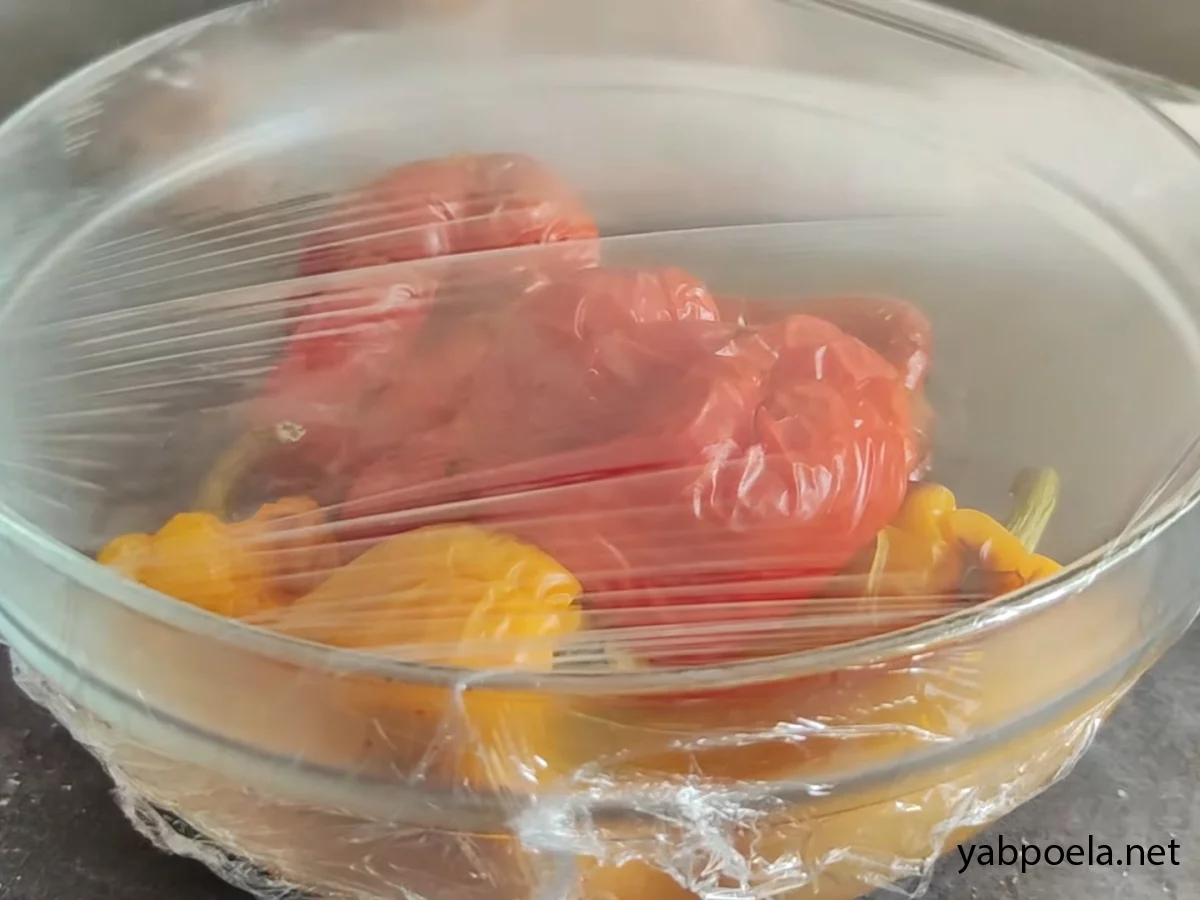 Готовые перцы сразу же складываем в пластиковый пакет или в миску, которую плотно накрываем пищевой пленкой. Оставляем на минут 20.