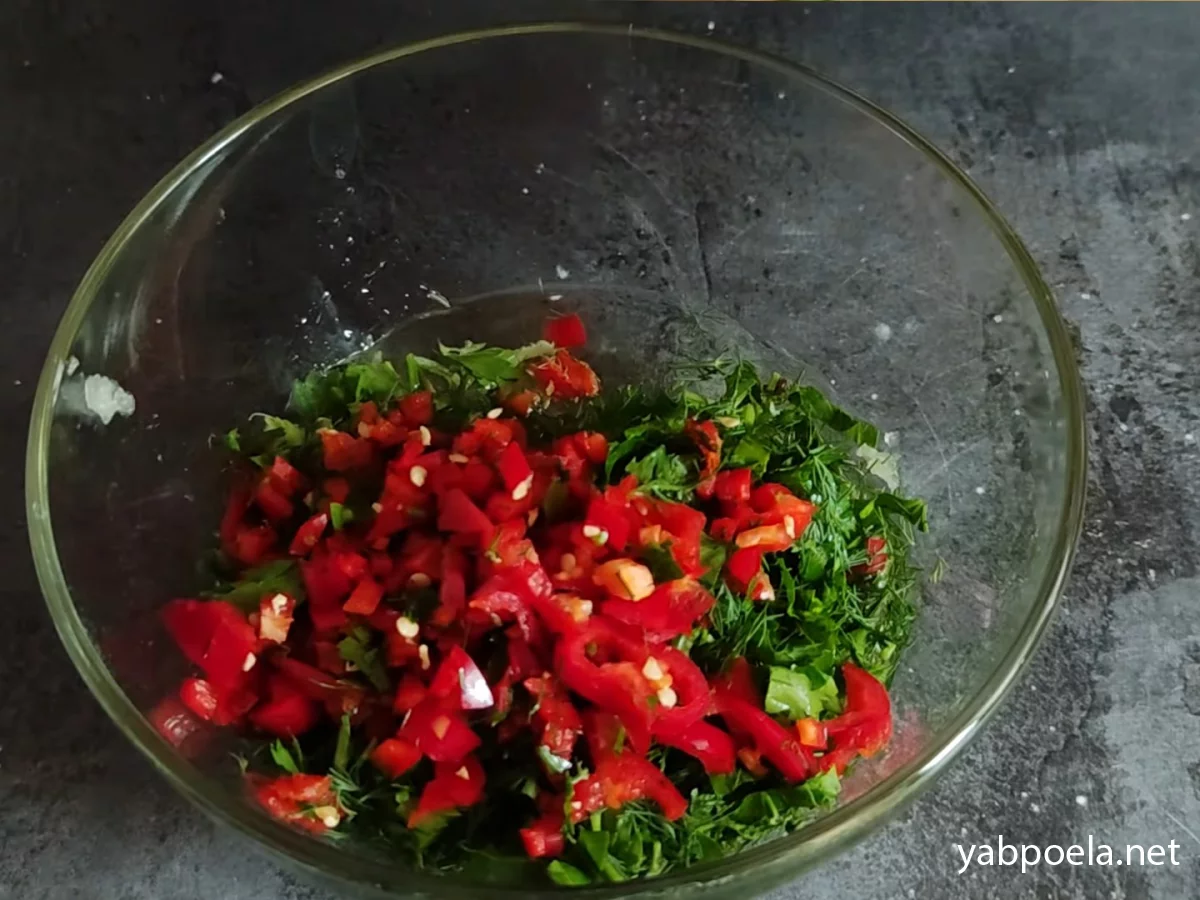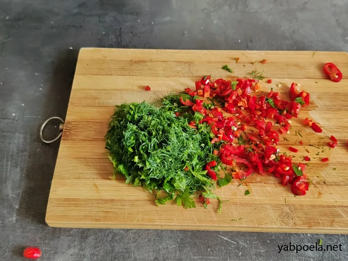 Сюда же перекладываем зелень с острым перцем. Перемешиваем.