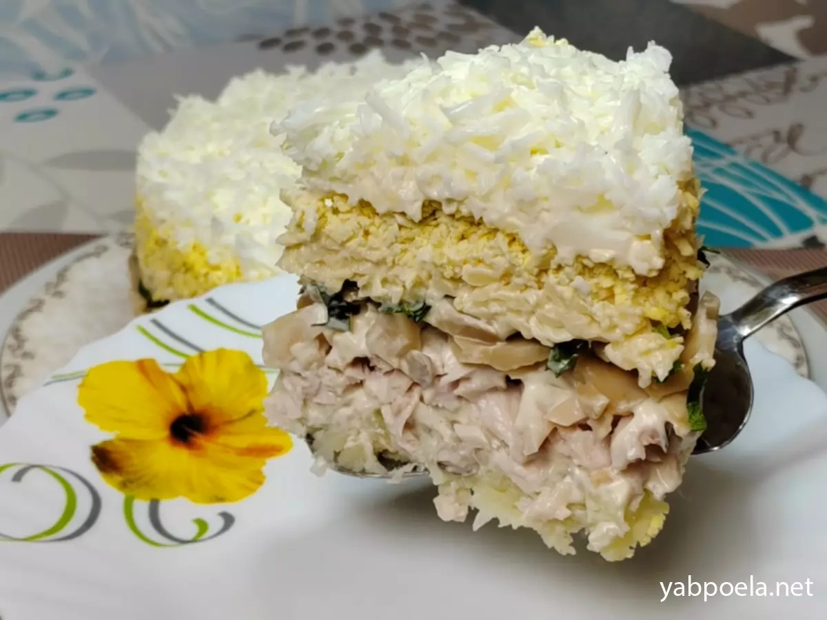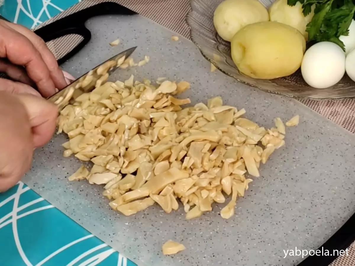 Совет: Можно использовать и свежие грибы, обжаренные с луком, но с маринованными (шампиньоны или вешенки) салат получается пикантнее и быстрее.