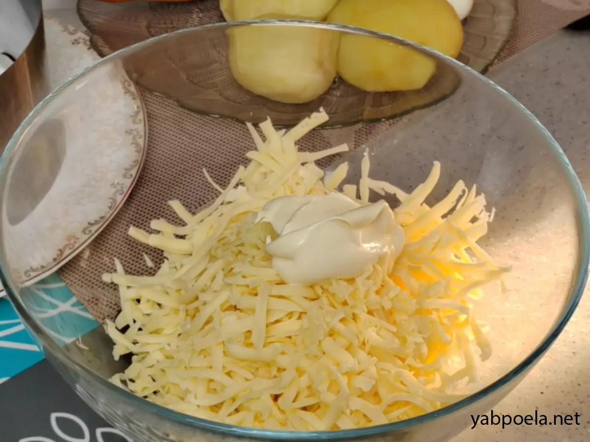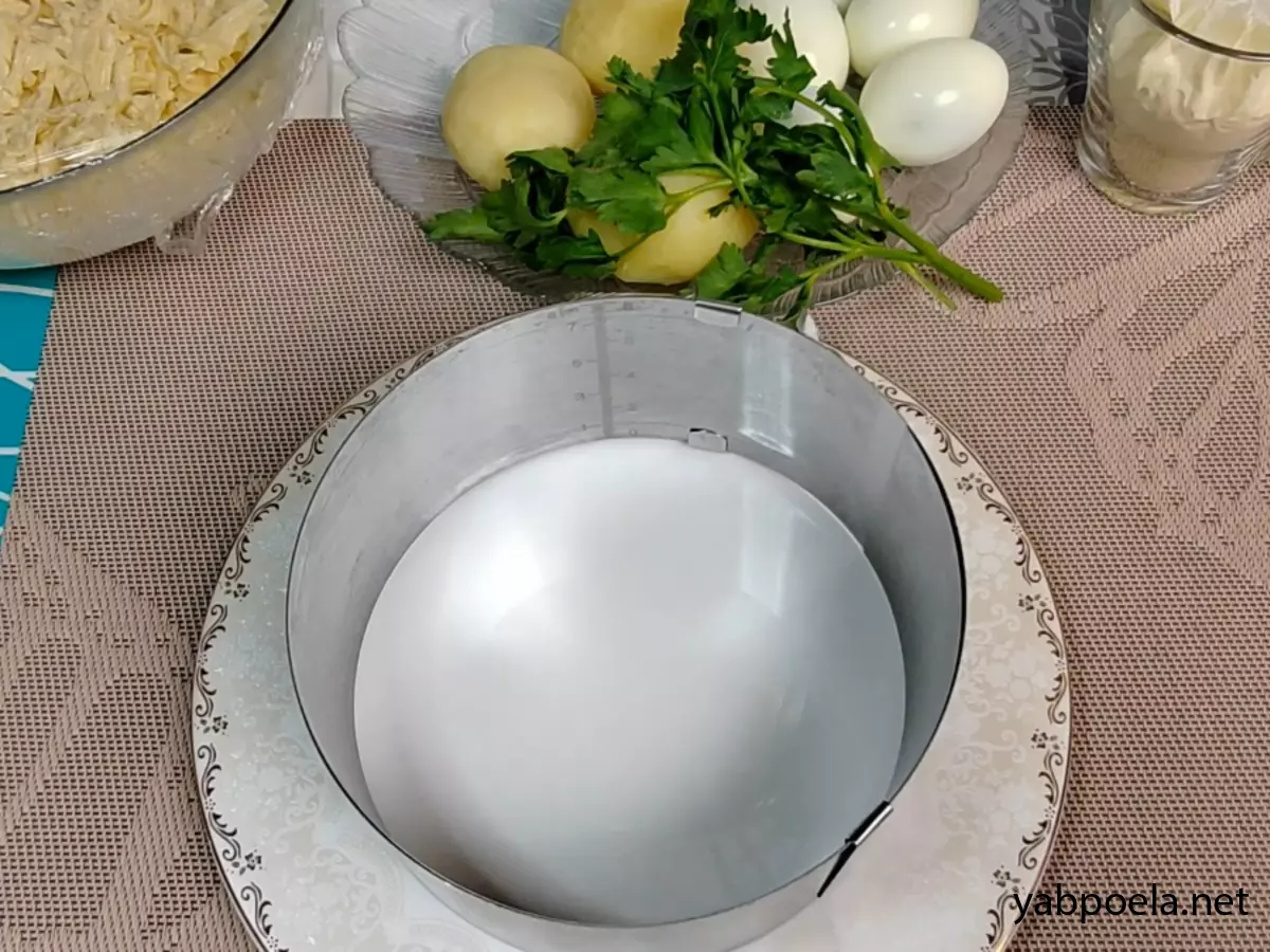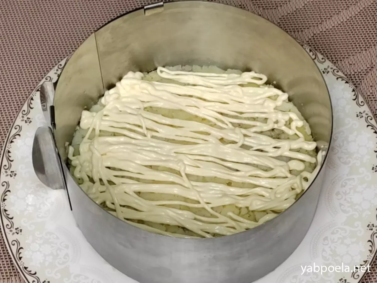 1-й слой (Основа): Натрите отварной картофель на крупной терке прямо в кольцо. Немного разровняйте, посолите и поперчите по вкусу. Сделайте сеточку из майонеза.